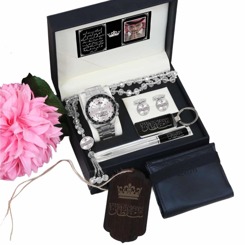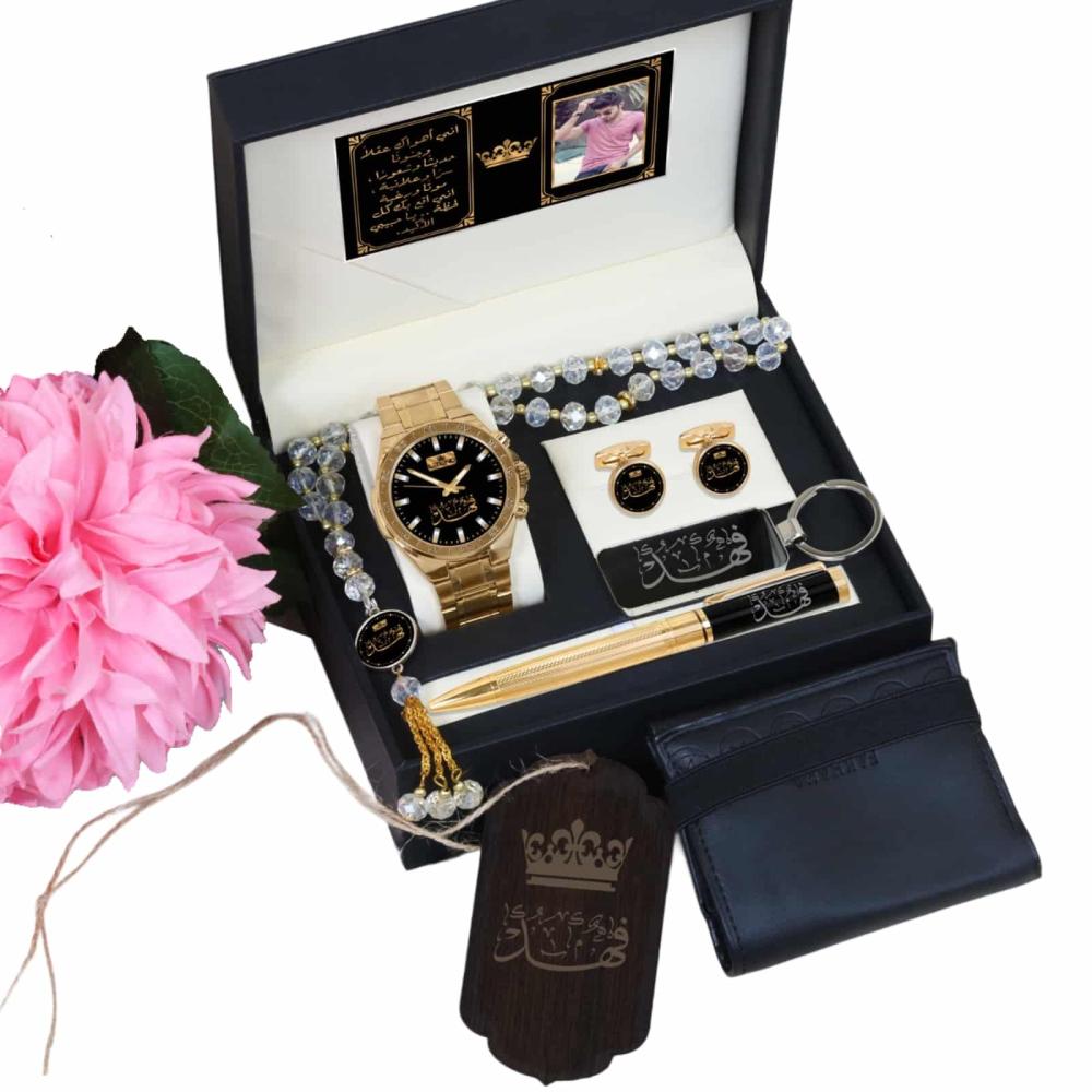 تميّز بإطلالة استثنائية مع واحدة من أجمل طقوم الساعات بالاسم المصممة خصيصًا لتُعبّر عن ذوقك الراقي. يتكوّن الطقم من ساعة رجالية أنيقة مرفقة بـ كبك محفور بالاسم، مسبحة فخمة باسمك، ميدالية مفاتيح محفورة بتقنية نحت الليزر، تعليقة سيارة بالاسم، محفظة جلدية أنيقة، وقلم فاخر باسمك محفور بدقة.