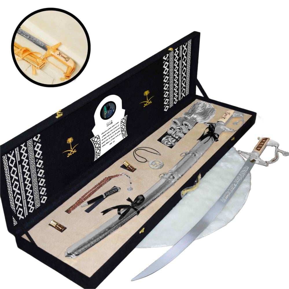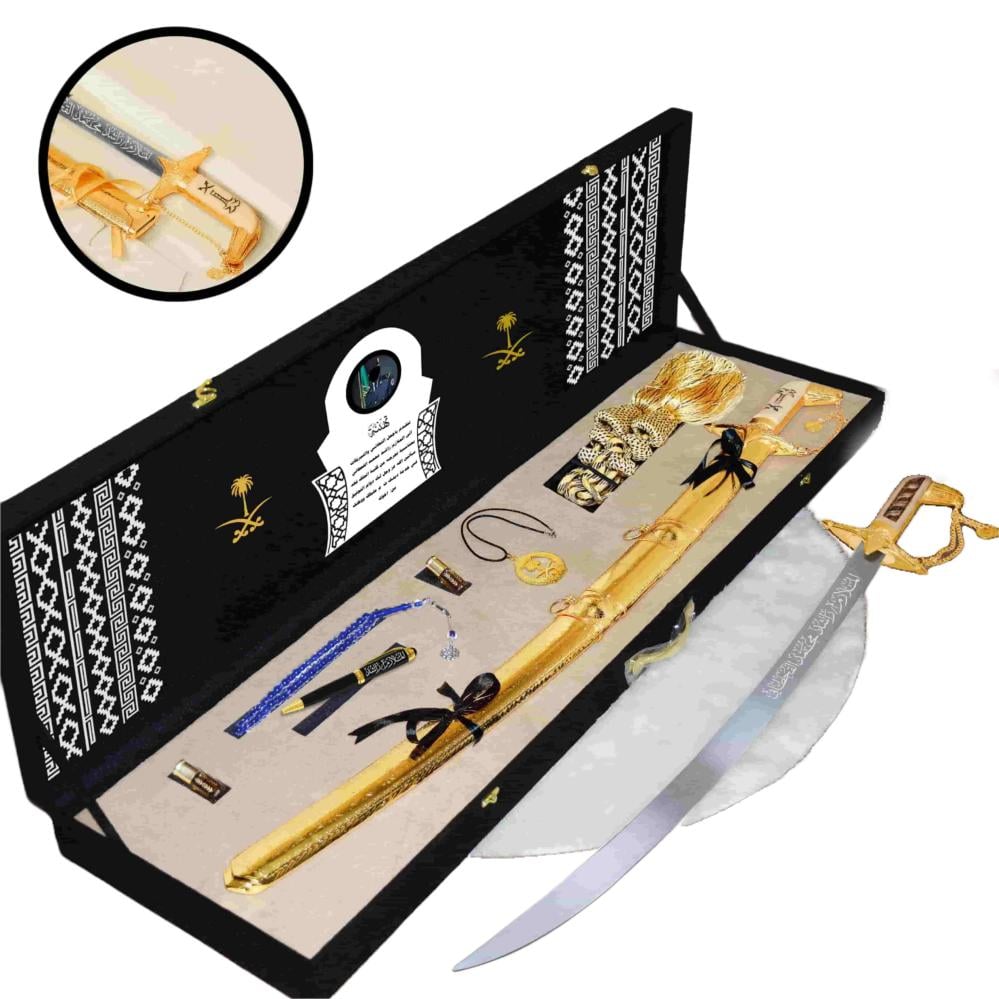 بوكسات هدايا رجالية فاخرة تجمع بين الفخامة والأصالة في تصميم ملكي راقٍ. الطقم الرجالي يحتوي على سيف فاخر مطلي مويه ذهب بتصميم أنيق متوفر باللونين الذهبي والفضي مع إمكانية نقش الاسم بالليزر حسب الطلب، ليمنح الهدية طابعًا شخصيًا مميزًا.