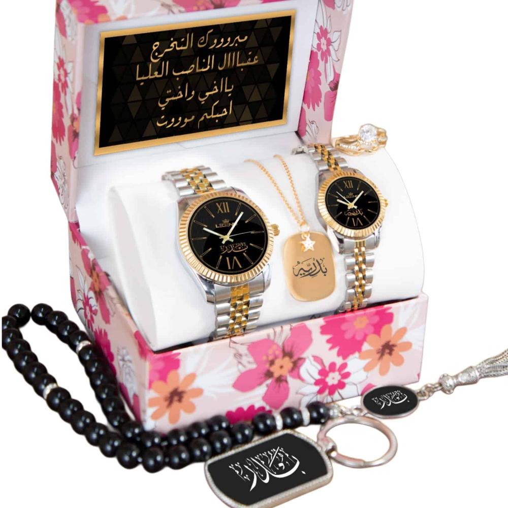 يجمع هذا الطقم بين ساعات رجالية بالاسم بتصميم فاخر، وساعات نسائية بالاسم بأناقة ناعمة، مما يجعله الهدية المثالية للأزواج أو للمناسبات الخاصة.